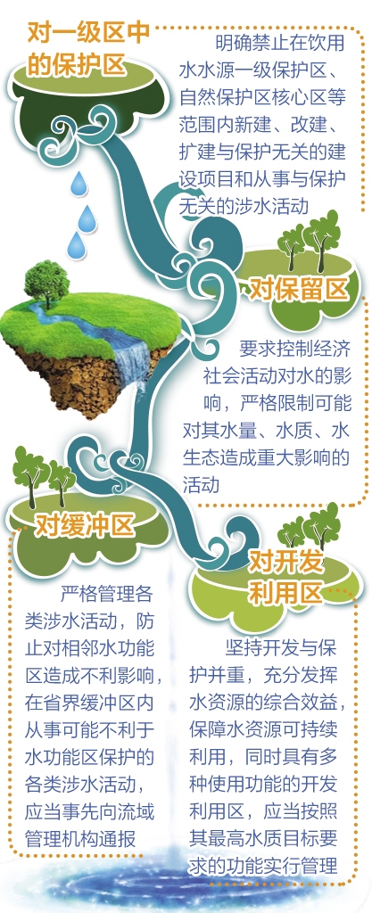 該辦法還對水功能區限制納污管理作了嚴格規定。石秋池說,為落實國務院對全國重要江河湖泊水功能區的批復要求和全面推行河長制的有關要求,辦法將水功能區限制納污管理作為核心內容,從以下5個方面作了規定: